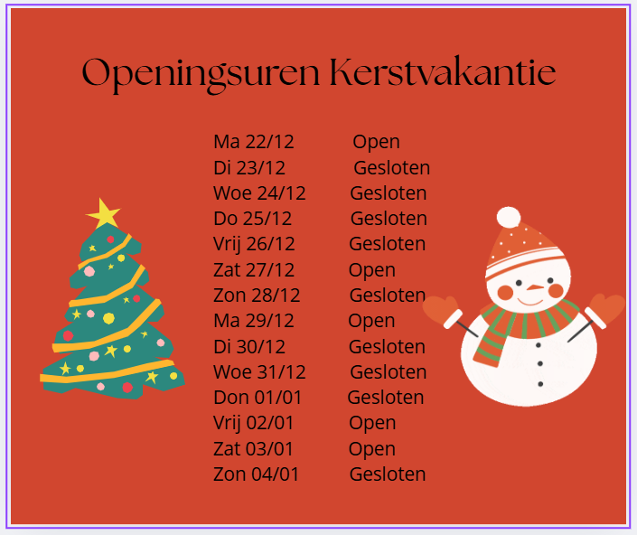 Let op gewijzigde openingsuren voor de kerstvakantie. Zie de nieuwsrubriek voor meer info! Negeren